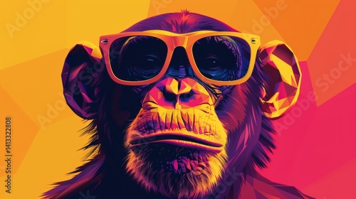 Fototapeta premium Stylized chimpanzee portrait with faceted geometric design wearing sunglasses...