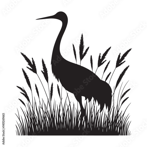 Fototapeta premium Stylized Crane Silhouette in Grasses Illustration for Nature Designs
