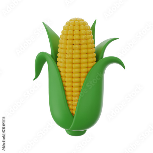 Obraz premium Stylized 3D render of a ripe yellow corn cob with green husks maize grain