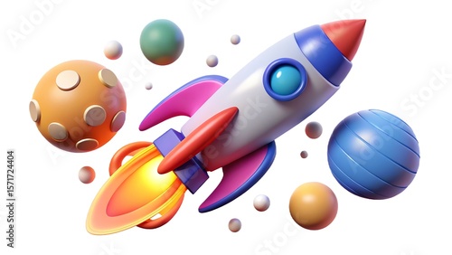 © Newaz, Naklejka premium Stylized 3d rocket ship launching through colorful planets and spheres isolated on white background