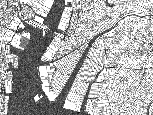 © W&S Stock, Naklejka premium Stylized decorative city map of Hekinan, Japan, hand-drawn in black and white.