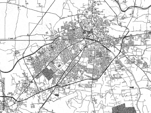 © W&S Stock, Fototapeta premium Stylized decorative city map of Thanjavur, India, hand-drawn in black and white.