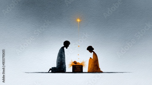 Fototapeta premium Stylized depiction of Mary Joseph and baby Jesus under the Star of Bethlehem