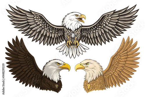 Fototapeta premium Stylized Eagle Illustration Set – Dynamic Poses, Feather Detail, and Artistic...