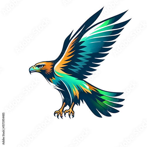 © Tanvir Rahman , Obraz premium Stylized eagle with vibrant teal orange and dark blue feathers in flight