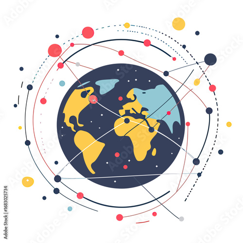 Obraz premium Stylized Earth globe with interconnected orbiting dots and lines symbolizing global network connections and communication systems in flat vector design