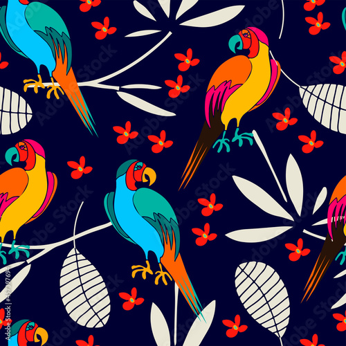 Fototapeta premium Stylized exotic birds seamless pattern. Vector illustration in bright colors. Tenplate for fashion print.