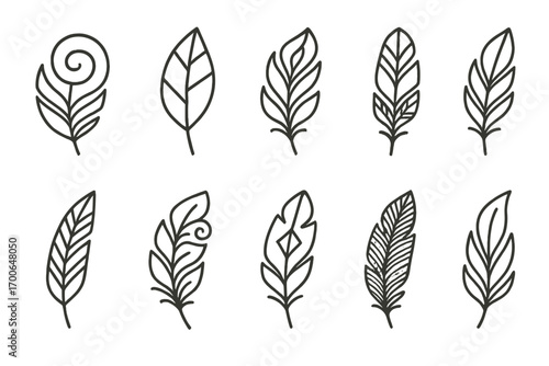 © Olha, Fototapeta premium Stylized Feather Icons. Line style icons of stylized feathers: spiral feather, geometric feather, abstract feather, symmetrical
