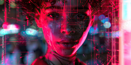 © Lila Patel, Fototapeta premium Stylized Female Portrait with Digital Circuitry Overlay