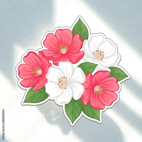 © Arviananda, Fototapeta premium Stylized floral illustration featuring pink and white flowers with green leaves, suitable for decoration, branding, greeting cards, and creative design projects.