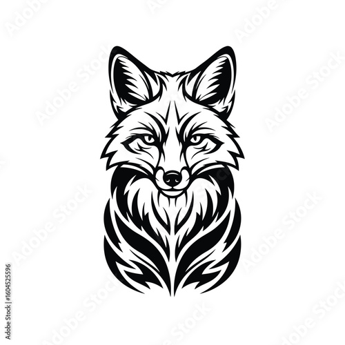 Obraz premium Stylized fox head illustration in black and white, featuring detailed fur patterns and a symmetrical design on a white background.