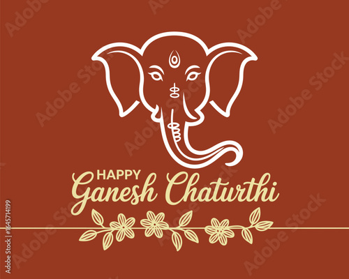 © Zavivec, Fototapeta premium Stylized Ganesh Chaturthi greeting with white line art of Lord Ganesha’s head, floral divider, and Happy Ganesh Chaturthi text on red background