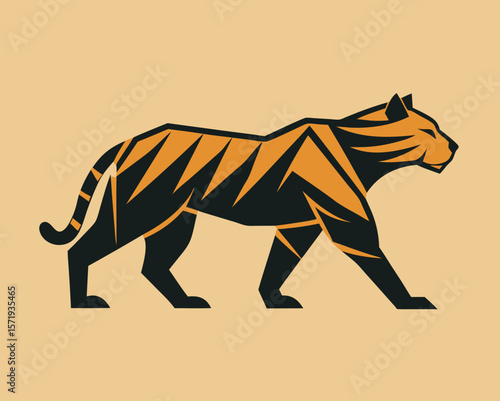 © Morjina, Fototapeta premium Stylized geometric tiger walking profile on a light brown background