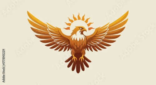 Obraz premium Stylized golden eagle graphic with rising sun emblem centered above the bird