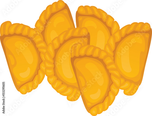 © vectorfusionart, Naklejka premium Stylized golden half-moon dumplings are overlapping in pile on transparent background, flat design