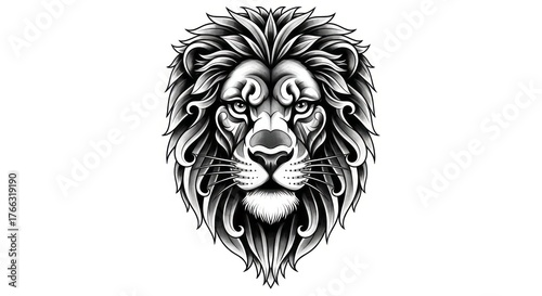 © Fandy creators, Obraz premium Stylized Grayscale Lion Head Illustration with Intricate Tribal Details on White Background
