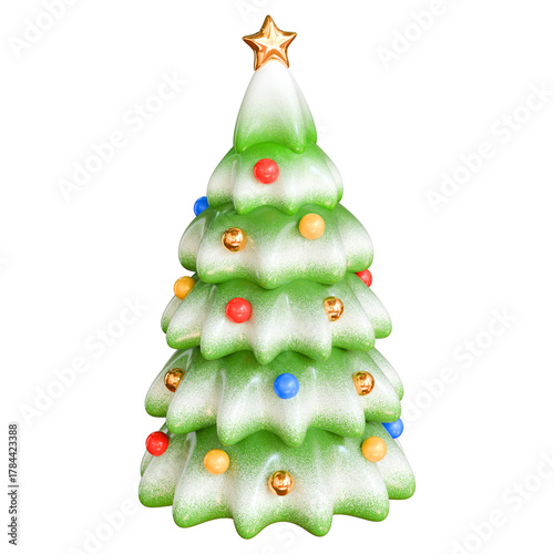 © Pagina, Fototapeta premium Stylized green Christmas tree with glossy colorful balls and snow frost. Concept of Christmas decoration and New Year. Isolated on transparent background. 3D render, minimalistic illustration