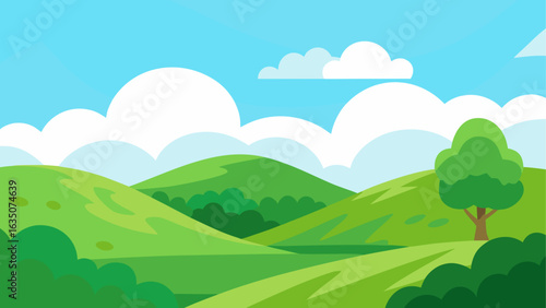 Fototapeta premium Stylized green hills and blue sky with clouds
