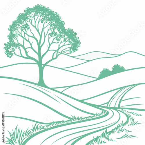 © ni, Obraz premium Stylized green line art landscape with a large tree and winding road through rolling hills