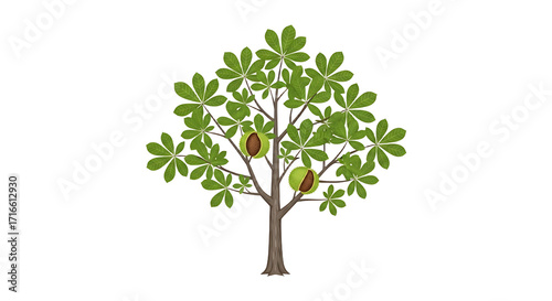 Fototapeta premium Stylized Green Tree with Brown Seed Pods and Leaves.