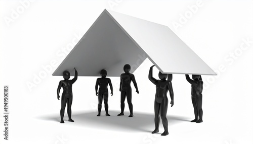 Obraz premium Stylized humanoid figures lifting triangular roof together, symbolizing...