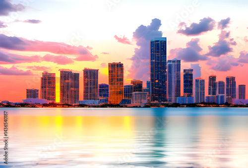 Fototapeta premium Stylized illustration of a city skyline reflected in water with bright colors...