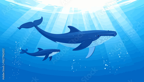 © background, Obraz premium Stylized illustration of a majestic blue whale and its young calf swimming gracefully side-by-side.