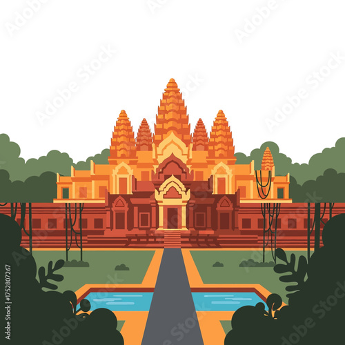 © Gilang, Naklejka premium Stylized illustration of Angkor Wat temple complex with pathway and lush greenery.