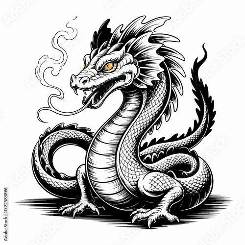 © Tabinda, Obraz premium Stylized Ink Drawing of Curled Dragon with Smoke and Scales | Black and White Dragon Illustration with Yellow Eyes | Detailed Mythical Dragon Artwork with Claws and Smoke