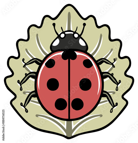 © Сергій Бомбак, Obraz premium Stylized ladybug with seven spots on a patterned leaf illustration