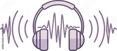 Obraz premium Stylized lavender headphones with purple outlines emitting sound waves and audio waveforms.