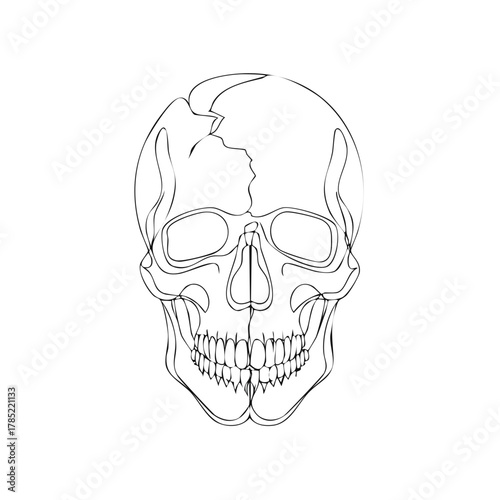 © FryArt, Obraz premium Stylized line drawing of a human skull with a cracked forehead and sharp teeth