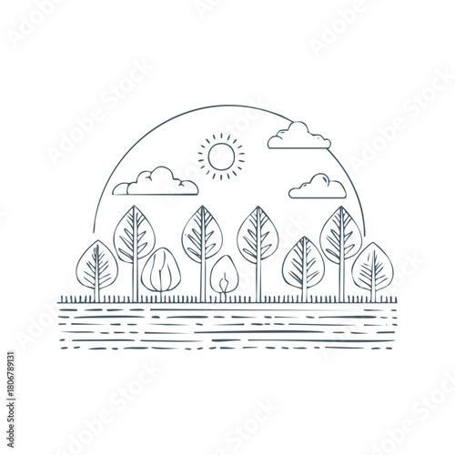 Fototapeta premium Stylized Linear Landscape with Trees, Sun, and Clouds