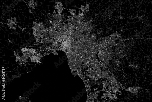 © Hairem, Obraz premium Stylized map of the streets of Melbourne (Australia) made with white lines on black background. Top view. 3d render, illustration