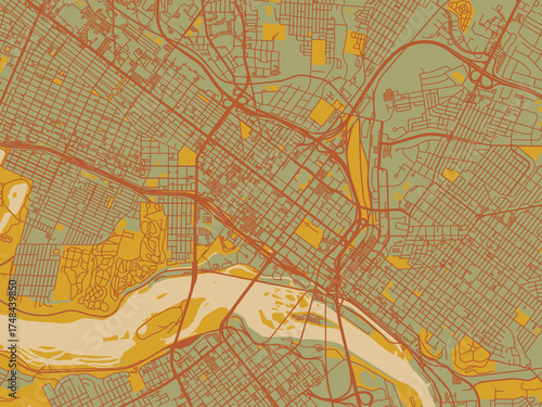© W&S Stock, Fototapeta premium Stylized minimalist map of Richmond Center, Virginia in muted sage base, rust-colored roads, and soft ochre highlights.