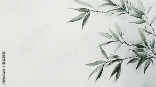 Fototapeta premium Stylized monochrome bamboo foliage with elongated leaves and branches on textured off-white background, soft diffused lighting creates tranquil minimalist artwork, contemporary