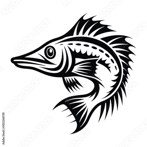 Fototapeta premium Stylized Monochrome Fish Illustration, Ornamental Fins and Sharp Spikes,...