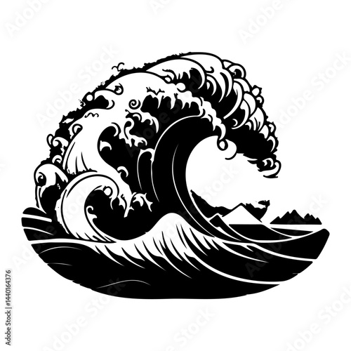 Naklejka premium Stylized monochrome illustration of a powerful ocean wave with coastal features