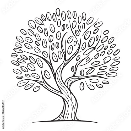Naklejka premium Stylized monochrome tree illustration with dense foliage and intricate trunk...