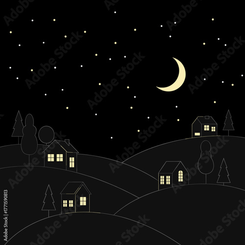 © sutiah-art, Fototapeta premium Stylized night landscape with houses, moon and stars on dark sky.