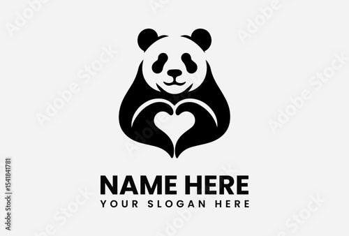 © vectorvovdesign, Fototapeta premium Stylized panda logo with hands forming a heart shape, text below.