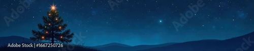 Naklejka premium Stylized pine, small shooting star, dark blue background, modern, holiday,...