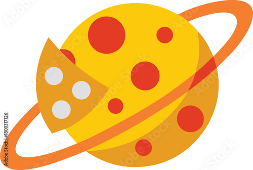 © RaselCreativeWorks, Fototapeta premium Stylized planetary body resembling a vibrant yellow cheese with red spots and a distinct, orbiting orange ring, featuring a wedge-shaped bite revealing white holes, rendered as a playful graphic icon.