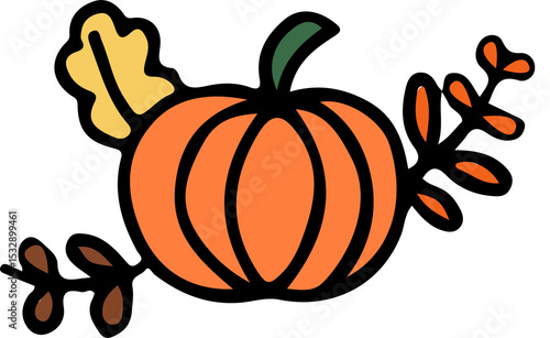 Obraz premium Stylized pumpkin is floating on transparent background in flat design, green stem and autumn leaves