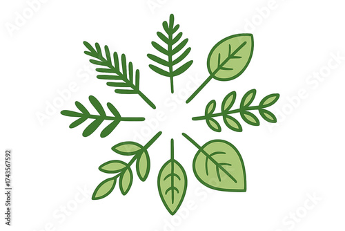 © icon_art, Naklejka premium Stylized radial botanical design featuring diverse green leaves and sprigs