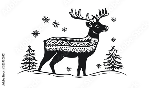 Obraz premium Stylized reindeer with snowflakes and trees, winter holiday season, linear...