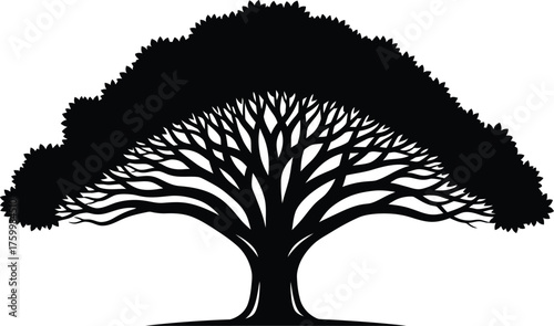 © CreativeAkash099, Naklejka premium Stylized silhouette of a majestic spreading tree with intricate branches and full crown flat design vector illustration white background