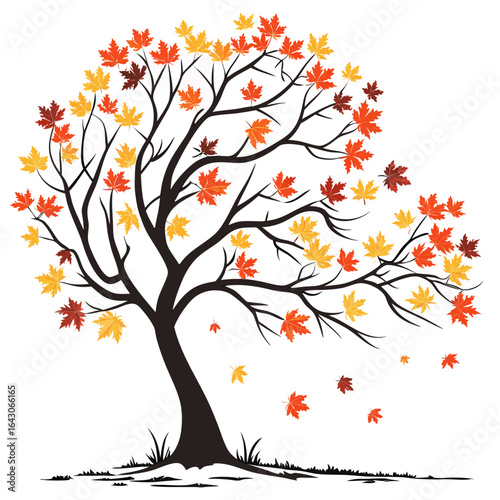 Fototapeta premium Stylized silhouette of a maple tree with falling leaves in autumn colors on a white background