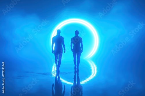 Fototapeta premium Stylized silhouettes of two men, motion-blurred in a surreal blue gradient field