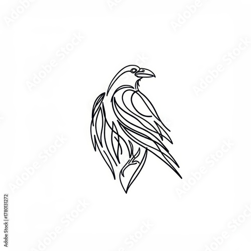 © Ariestia, Obraz premium Stylized single line drawing depicts a profile view of a majestic corvid perched against a white background.